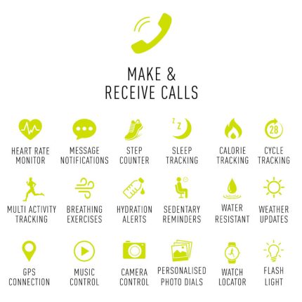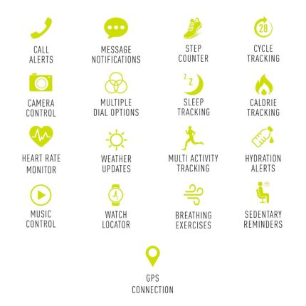 Bluetooth 5.0 ,Ασκήσεις αναπνοής ,Ειδοποιήσεις social media ,Ειδοποιήσεις για τον καιρό ,Ειδοποίηση κλήσεων ,Έλεγχος μουσικής ,Ενημέρωση ενυδάτωσης ,Έξυπνες ειδοποιήσεις και εμφάνιση μηνυμάτων SMS ,και άλλα ,Καταγραφή αθλητικής δραστηριότητας ,Λειτουργία GPS ,Λειτουργία εύρεσης ρολογιού ,Λειτουργία εύρεσης τηλεφώνου ,Μέτρηση απόστασης ,Μέτρηση θερμίδων ,Μετρητής βημάτων ,Παρακολούθηση ύπνου ,Προσφέρει λειτουργία υπενθύμισης έμμηνου κύκλου για τις κυρίες ,Σύνδεση GPS ,Χειρισμός κάμερας από απόσταση |